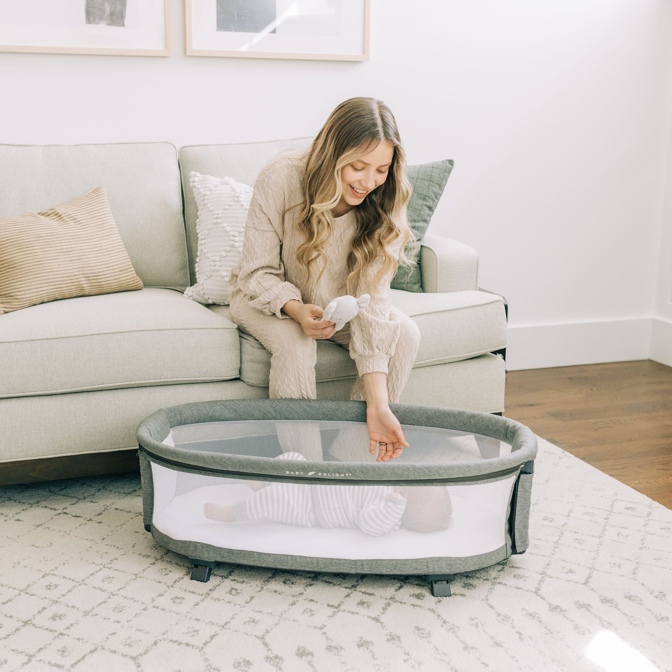 - Bassinet can be used in the sturdy base or removed for portability in any room in the home
